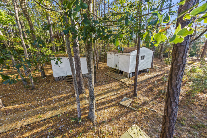 Has two detached storage buildings and a carport.