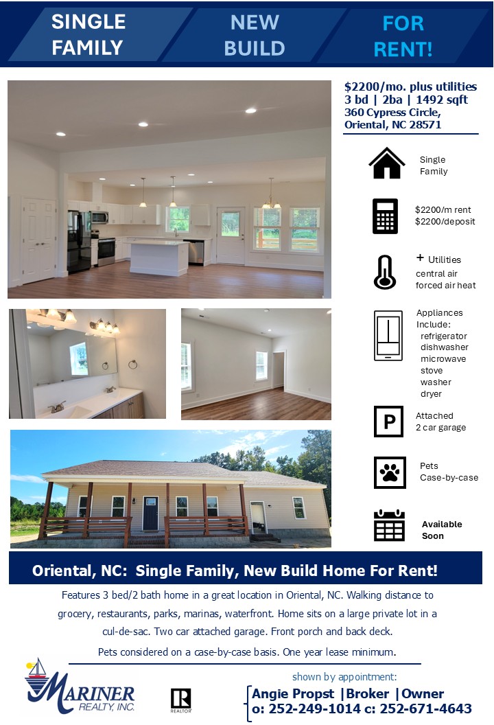 FOR RENT! Single family, new build home is for rent. This well appointed home features an open floor plan, 3 bedrooms, 2 full bathrooms and is in a great location in Oriental. Walking distance to grocery, restaurants, parks, marinas, parks and waterfront. This home sits on a large private lot in a quiet cul-de-sac. Attached garage, front and back deck. All brand new, upgraded appliances that include: refrigerator, dishwasher, microwave, stove, washer and dryer. Pets considered on a case-by-case basis. One year minimum lease. Rent is $2200 per month, plus all utilities. Deposit of $2200 required. Nothin’ could be finer.